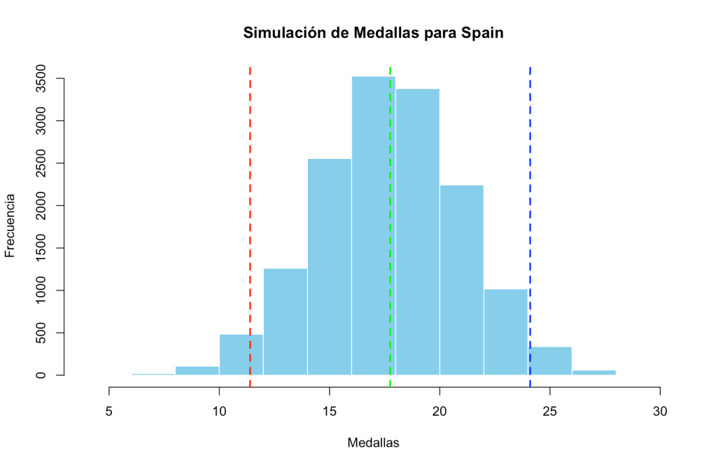 Según las predicciones llevadas a cabo por alumnos de la agencia EFE, basados en el análisis de datos, España obtendrá 17,5858 medallas en total en los próximos Juegos Olímpicos de París 2024 , con un intervalo de confianza del 95% (lo que asegura su fiabilidad y exactitud), y con un rango de probabilidad entre 13 a 24 medallas (gráfico 2).